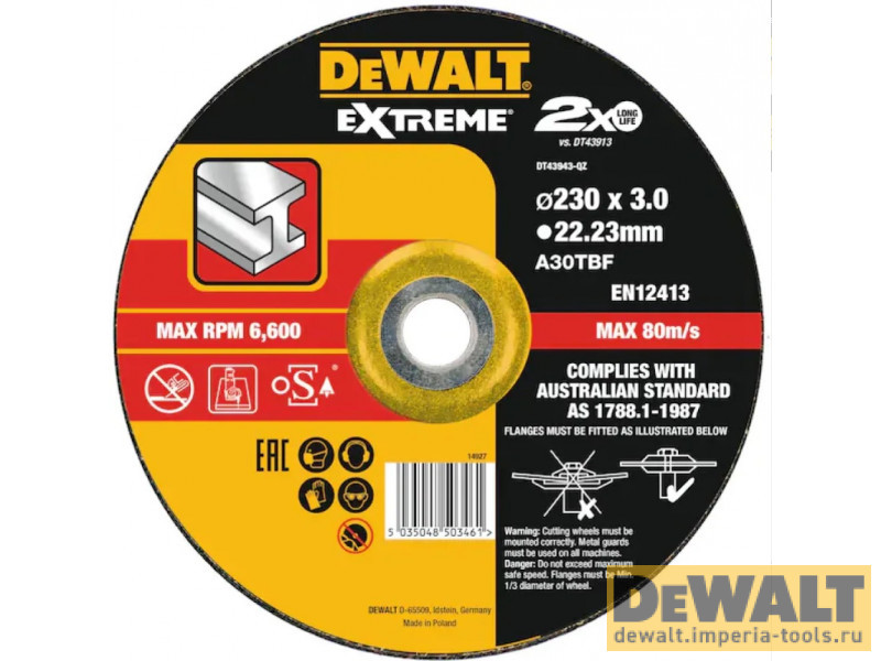 Круг отрезной по металлу EXTREME 230x22.2x3.0 мм DEWALT DT43943-QZ.